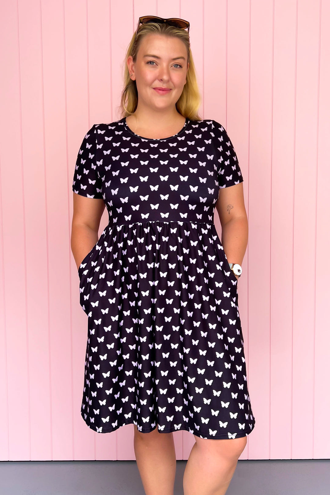 Butterfly Imprint - Knee Length Dress - Short Sleeve - Pockets