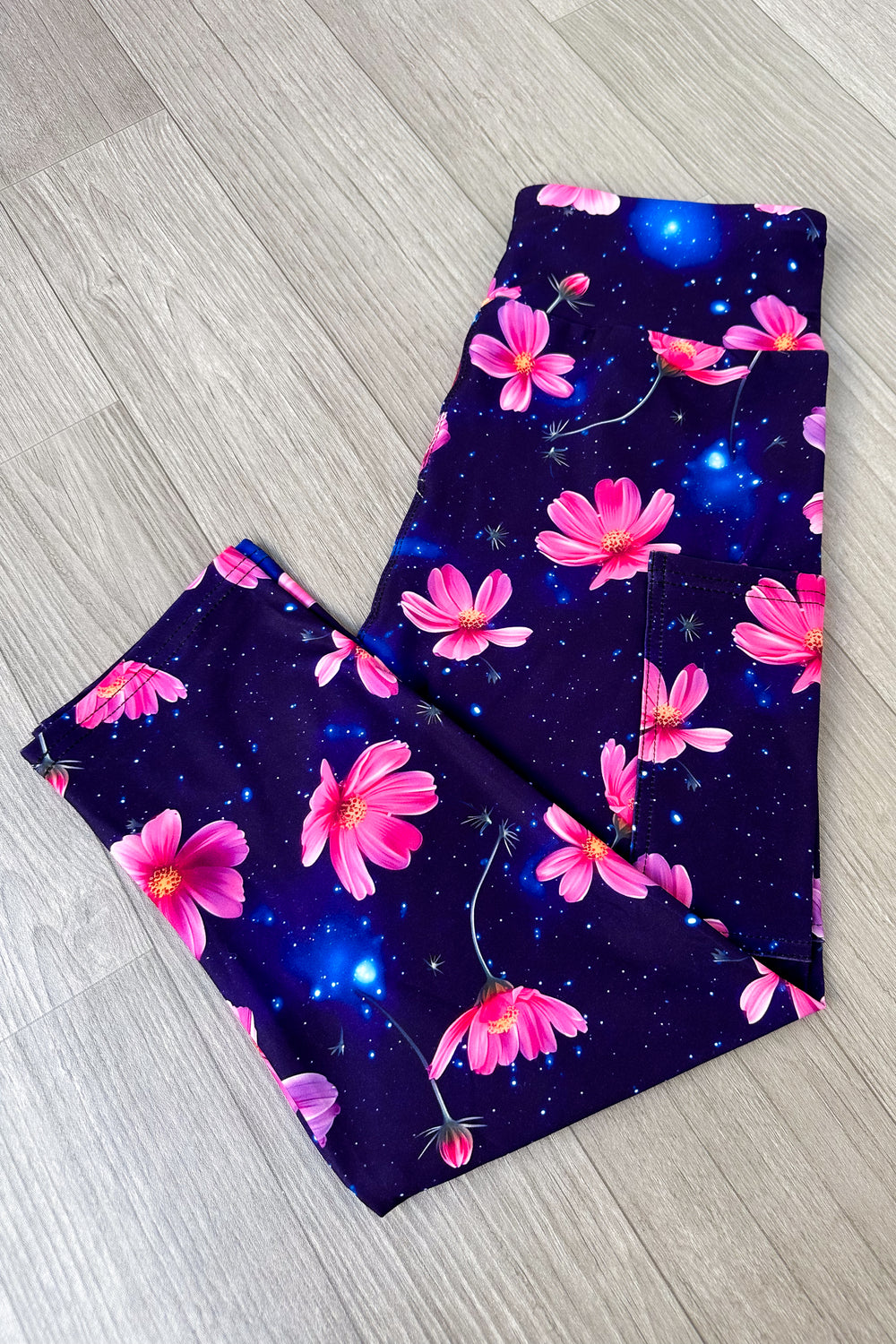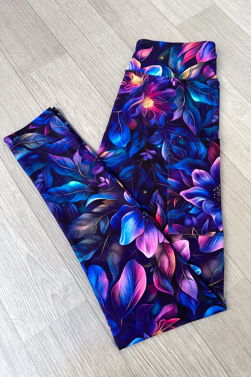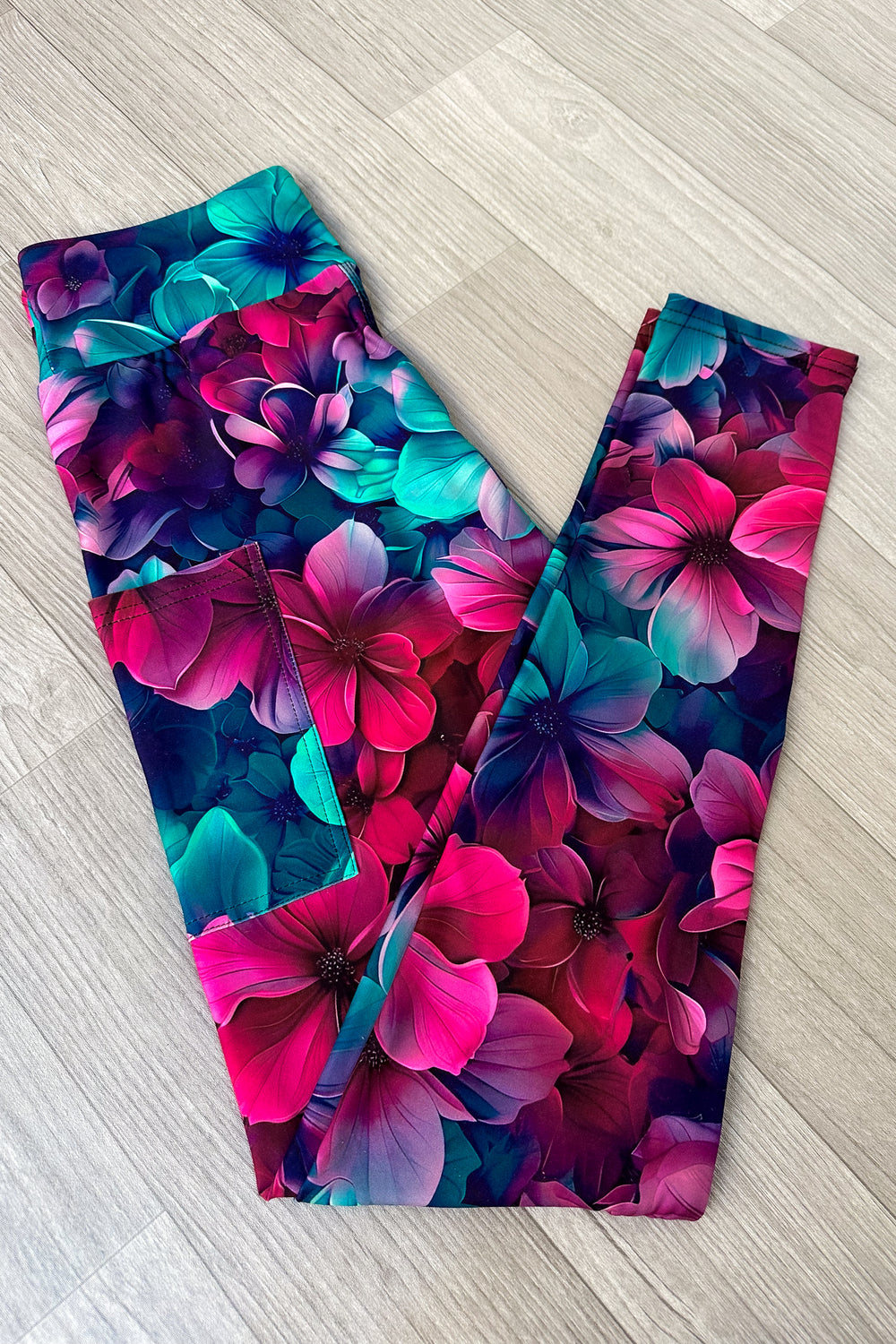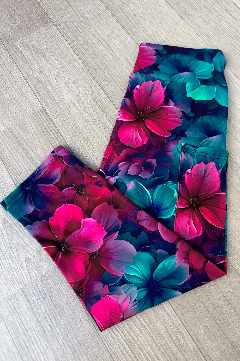 Floral-patterned leggings on a wooden floor
