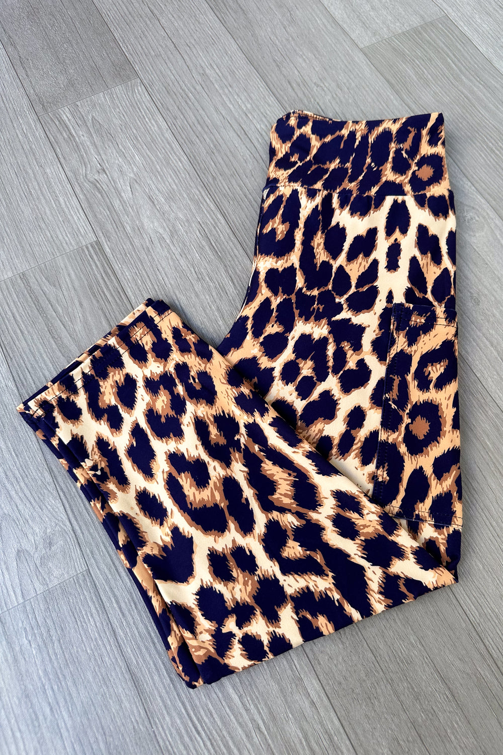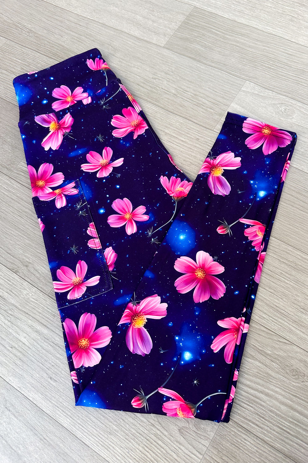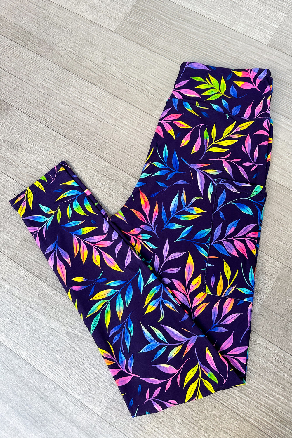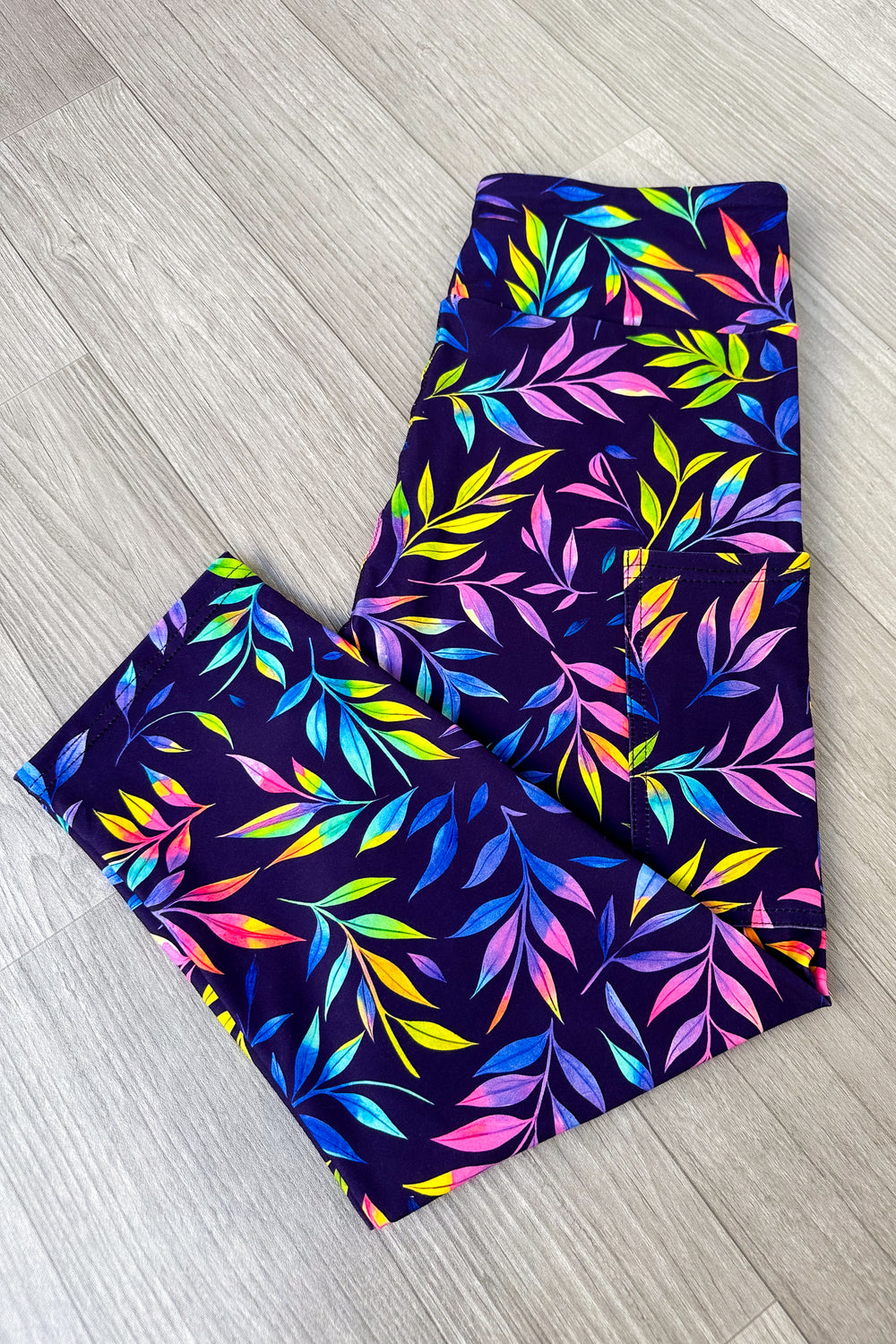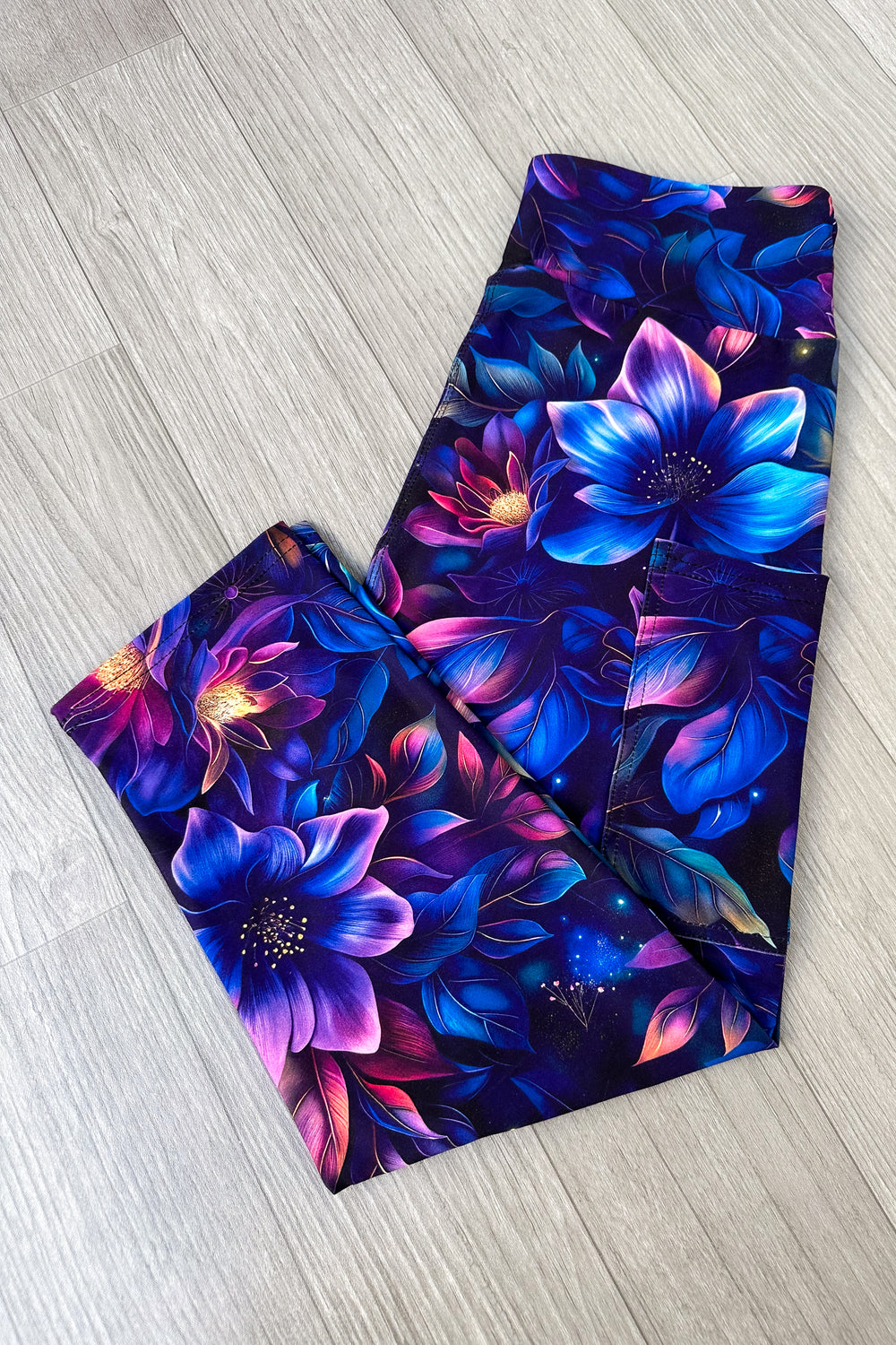 Floral-patterned leggings on a wooden floor