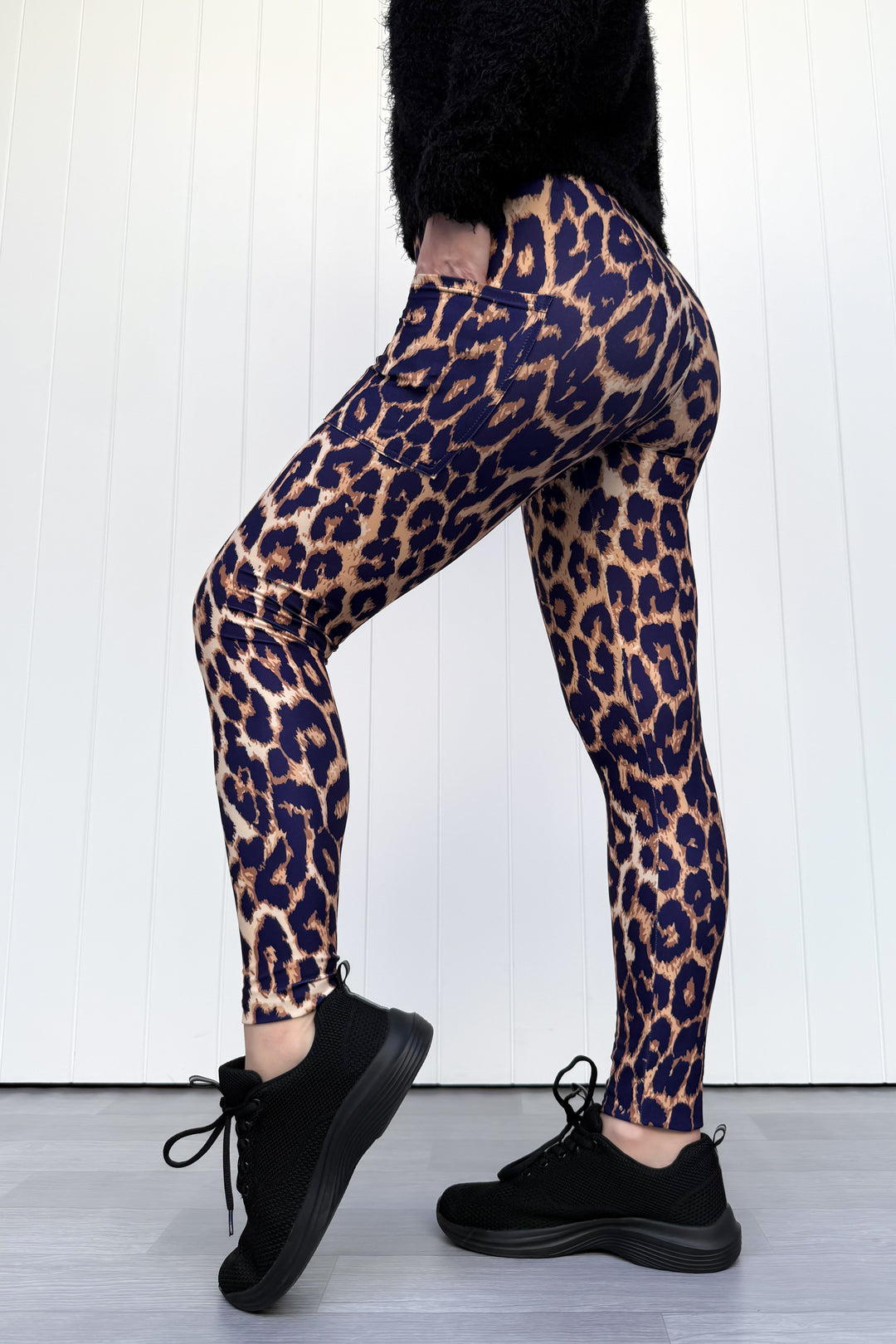 Person wearing leopard print leggings with a plain white background