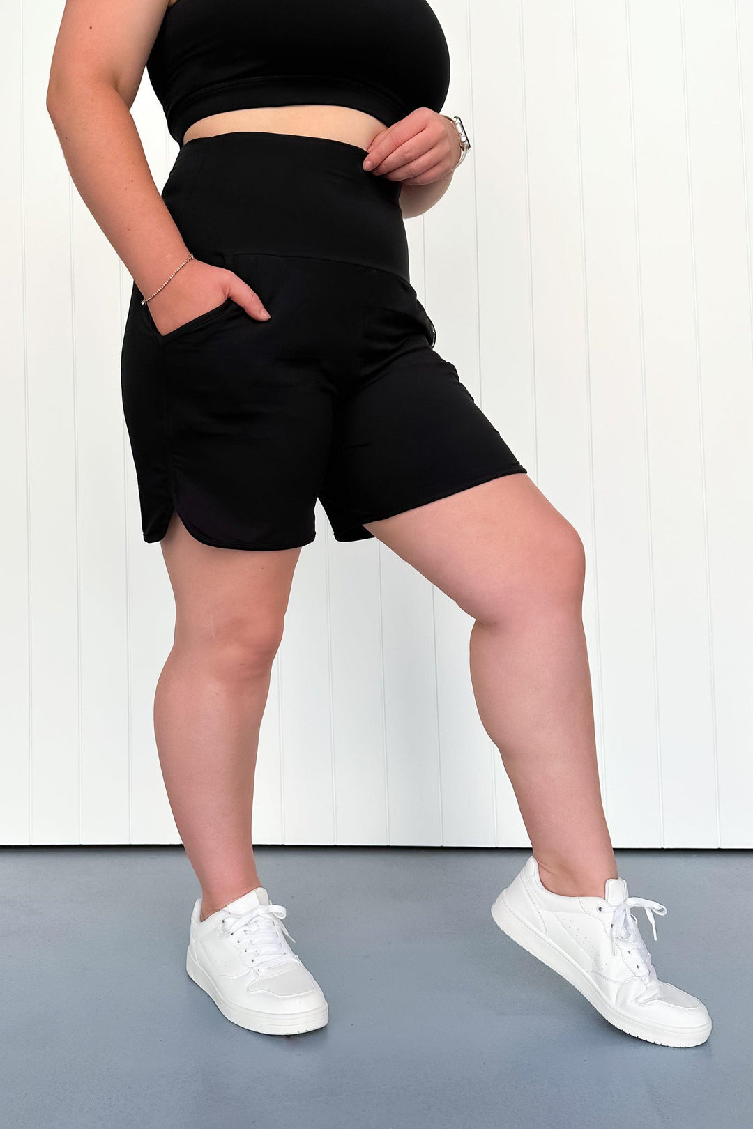 Hybrid Pocket High Waist Jogger Shorts made with a leggings style comfy waistband, large pockets in a long shorts design, and no elastic in the waistband for a super comfy fit.