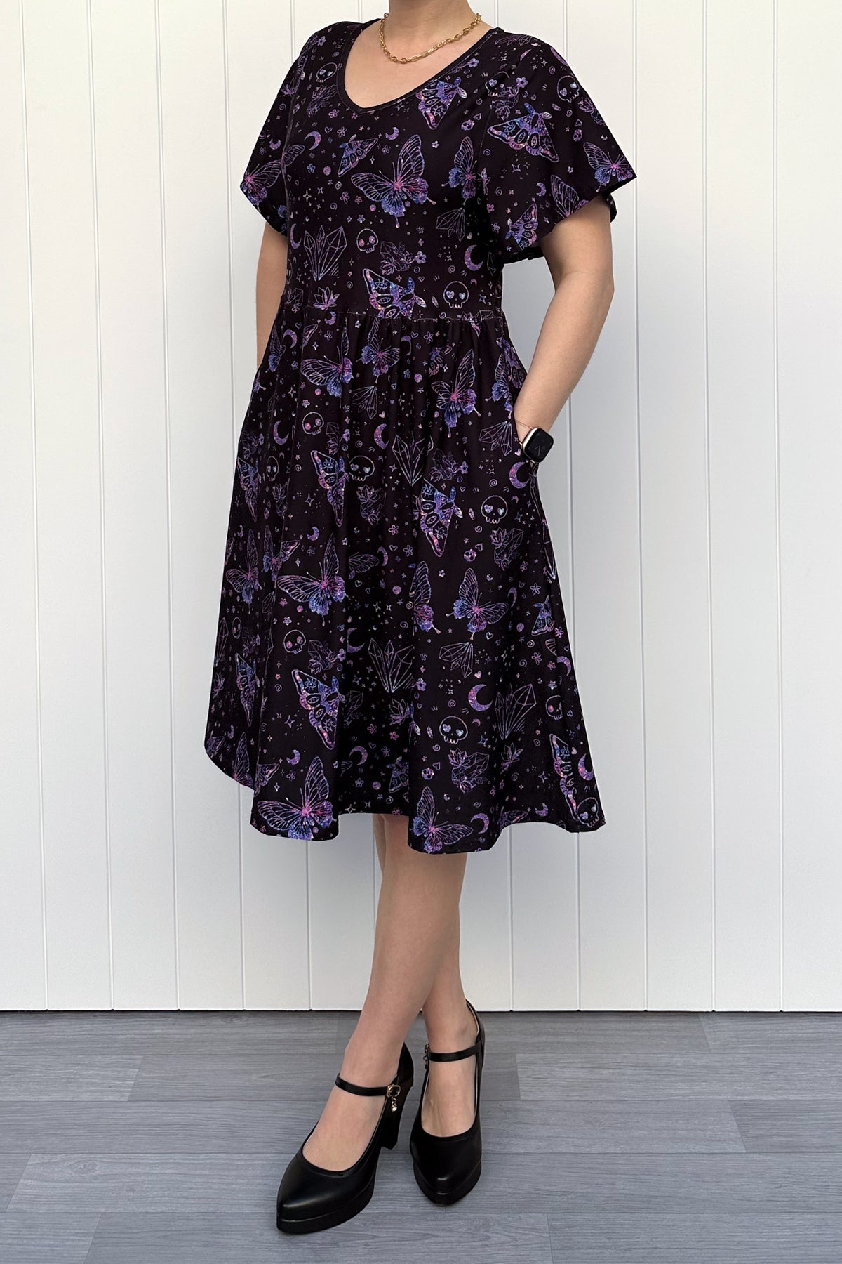 The Glitter Witch Pocket Dress is spellbinding with purple butterflies, crescent moons and glitter-like stars scattered across an inky black sky. Crafted from stretchy, comfortable fabric, it’s breathable enough for daytime adventures and soft enough to keep you happy all night. With flutter sleeves, a flattering knee length skirt, and sweet-ready pockets, you’ve got a dress that’s ready for every enchanting moment.