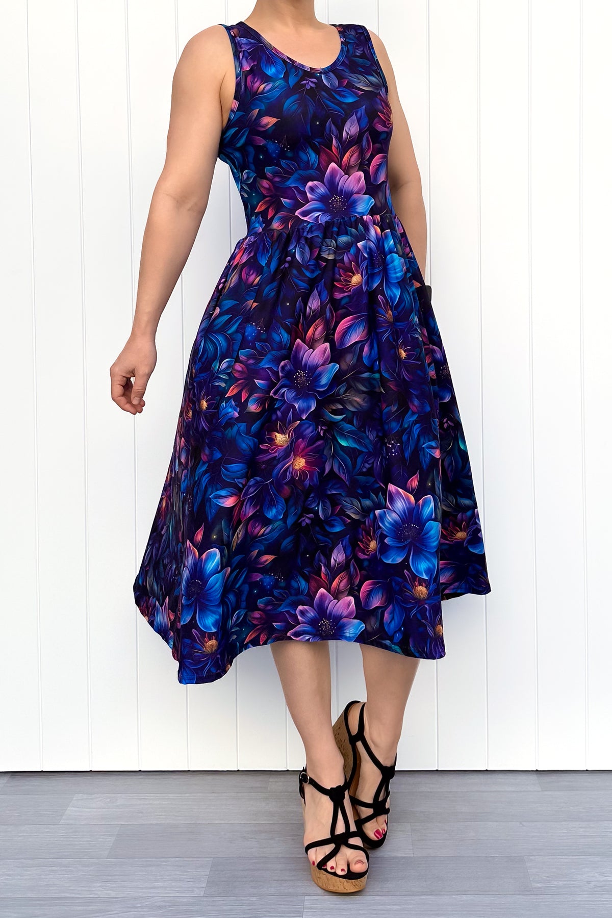 The Obsidian Petal Sleeveless Midi Dress wraps you in deep blues, purples and glowing petal tones layered over a shadowy base, giving the dress a dramatic but elegant feel. The soft stretch fabric moves with ease, the relaxed design keeps things comfortable, and the pockets add the convenience you always appreciate. It is a rich, expressive dress for those who love colour that leans into the night.