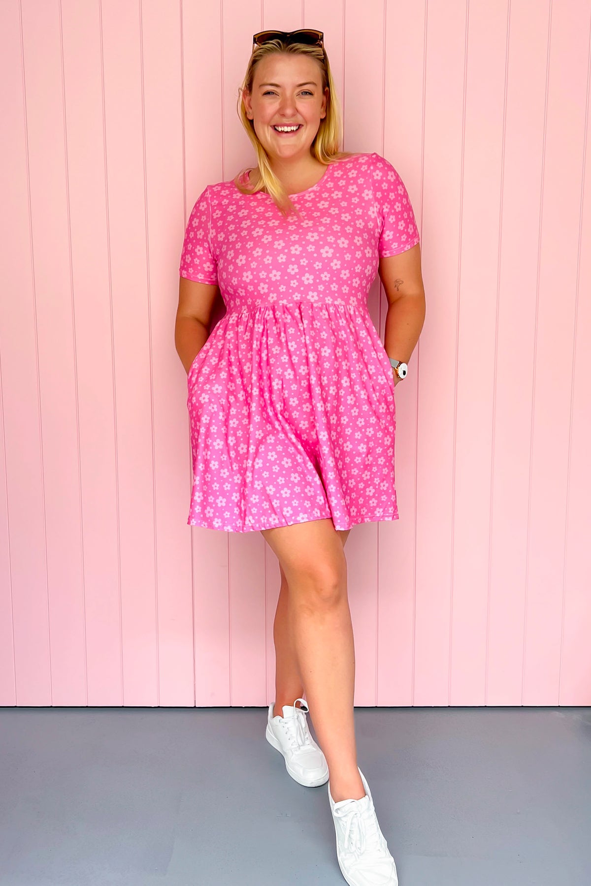 Remember when life was all about playing outside and picking daisies instead of figuring out what's for dinner....again? Our Pink Daisy Confetti Mini Dress brings a little of that carefree fun back, without the grass stains. The sweet daisy design on a bright-pink background is fun, fresh and full of personality, making it perfect for adding a bit of fun to your wardrobe without going full disco-ball. And if you're someone that prefers wearing shorts under your dress for extra comfort, you can pair it with the matching shorts*.