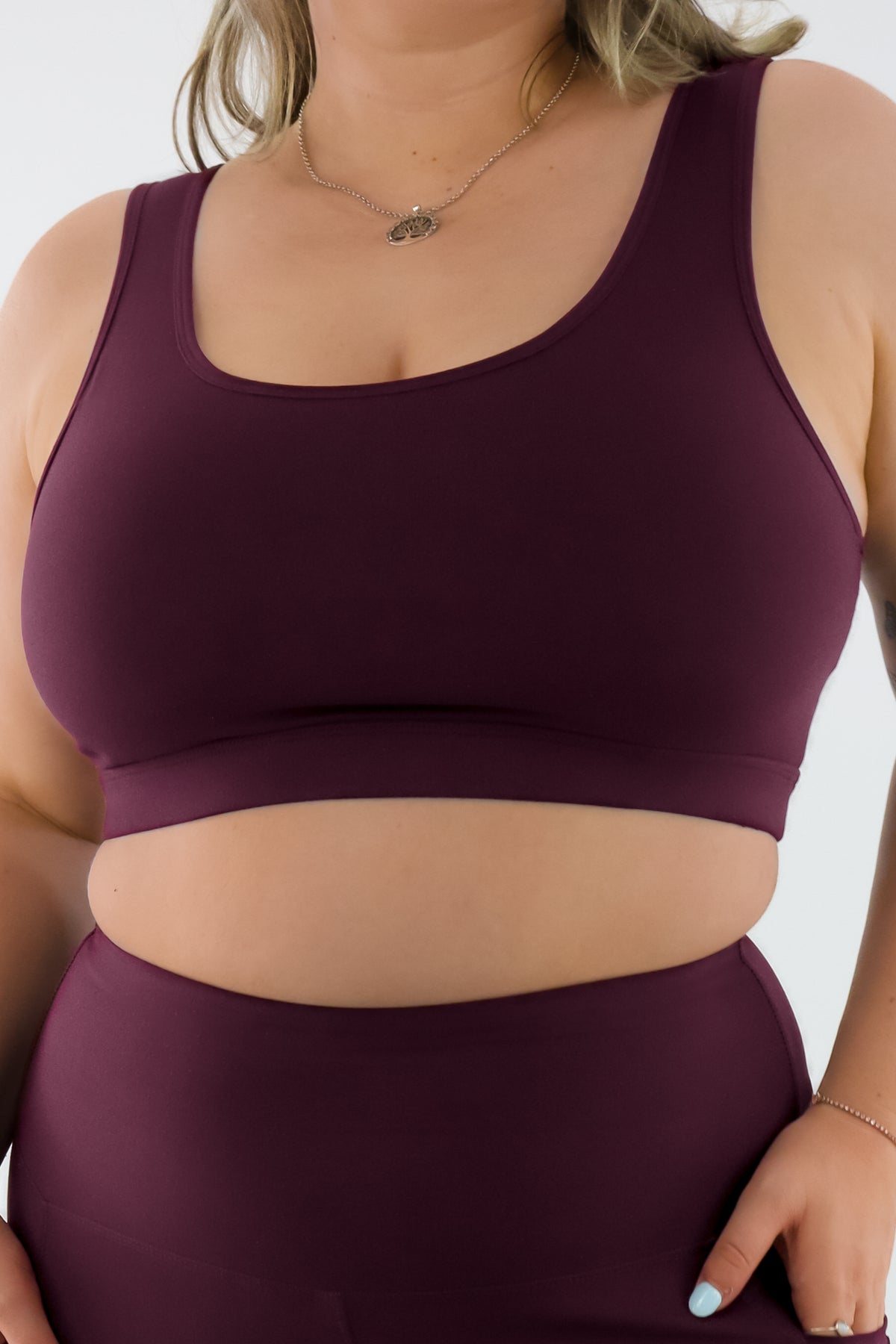 Person wearing a maroon sports bra and leggings on a white background