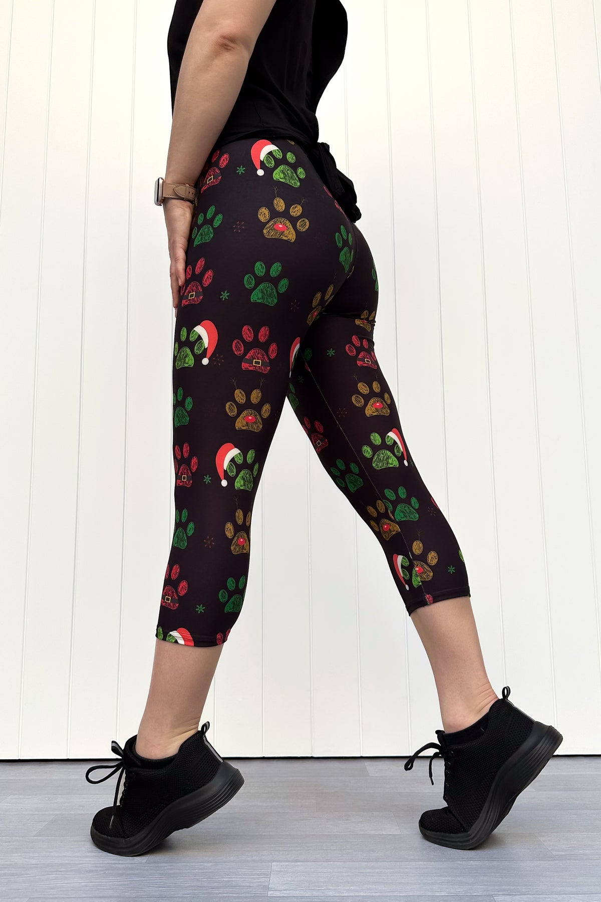 Person wearing black capri leggings with red, green and yellow paw print pattern with santa hats, standing against a white wooden panel background