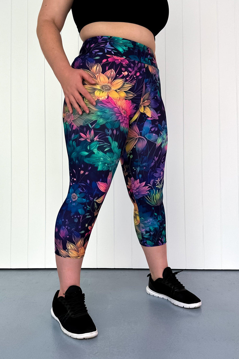 Scintillate Florals Casual Capri Leggings features deep, bright coloured florals on a purply/blue background. Made from our signature buttery soft fabric, it'll feel like wearing nothing.