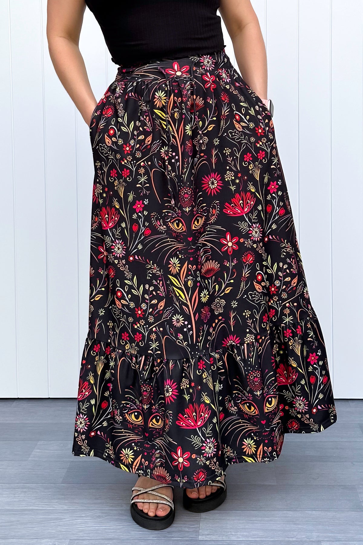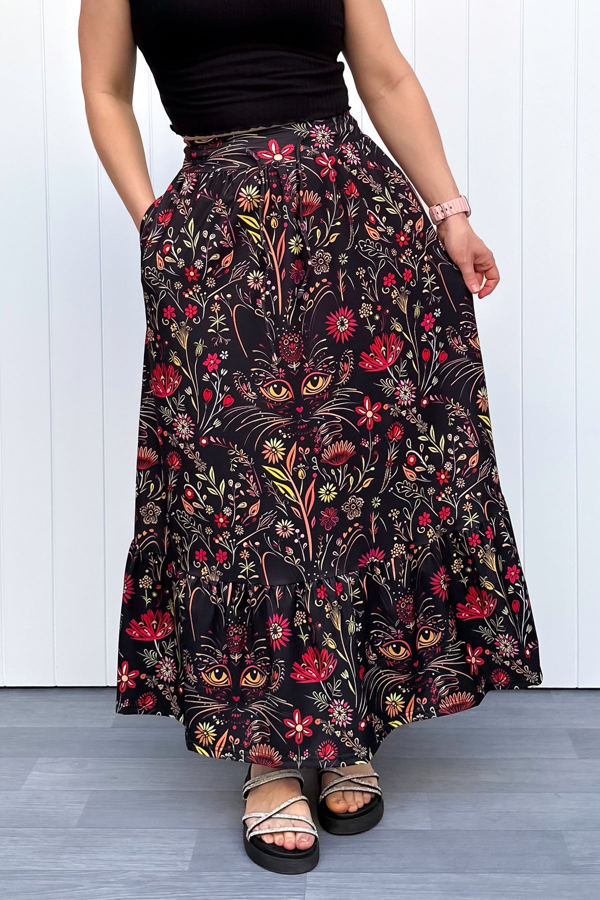 The Whiskers & Wildflowers Selene Maxi Skirt brings a little magic to your wardrobe, blending curious feline eyes with blooming florals across a rich dark base. It’s whimsical without being loud and detailed in a way that keeps revealing something new every time you wear it.