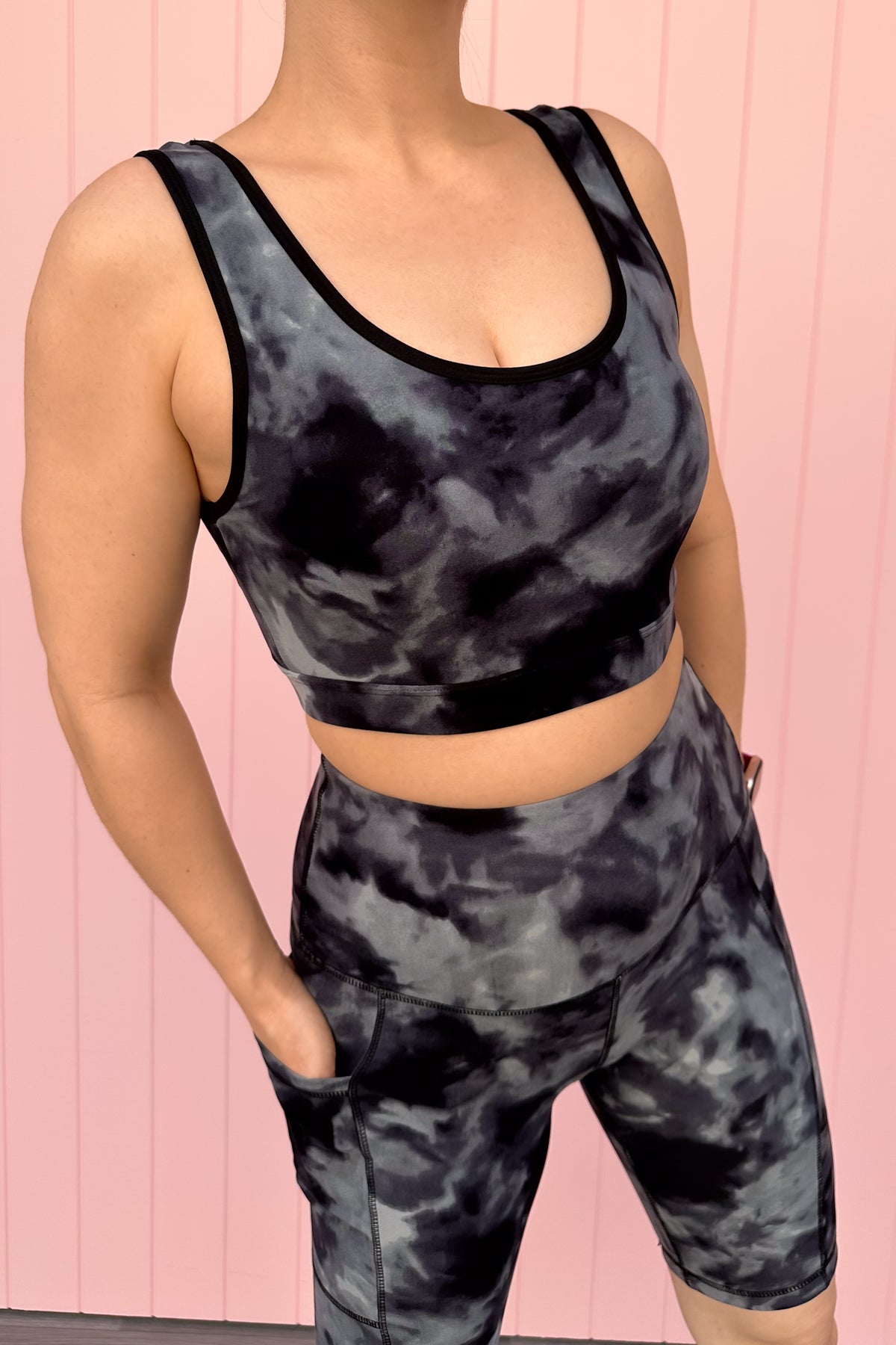 The Stormy Tie Dye Crop Top mixes soft greys and dark swirls for a bold, modern look that feels equal parts cool and comfy. Its reversible design lets you wear it high neck or scoop, while the brushed, double lined fabric keeps you supported and soft all day long. Lightly structured with removable padding, it’s made to move with you wherever your day drifts.