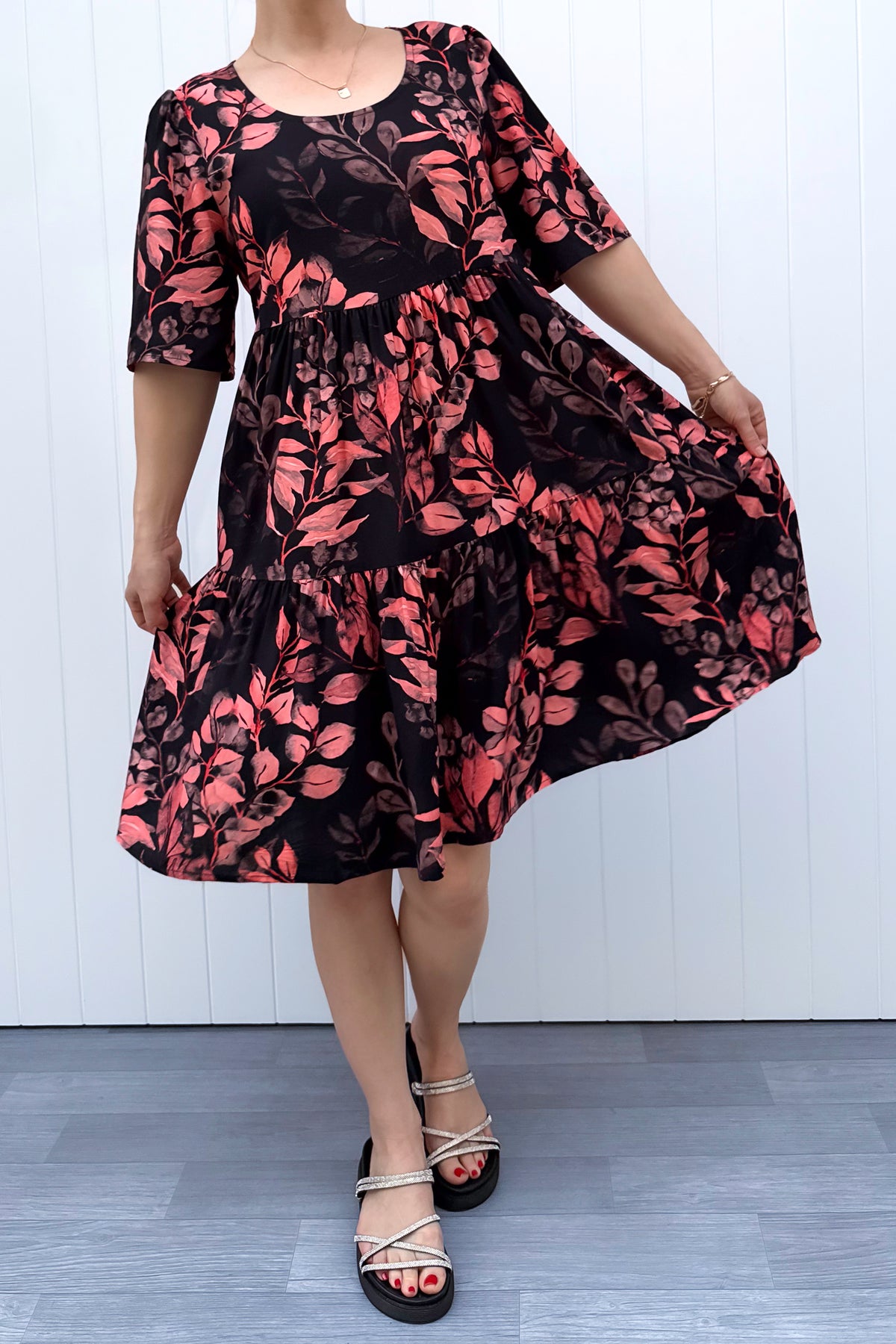 The Vintage Watercolour Leaves Lily Dress feels like a walk through an old garden at dusk, with dusky blush leaves scattered across a deep inky base. It’s calm and timeless, the kind of dress that draws people in the closer they look. With a relaxed, flowy fit, this dress is all about movement and ease. The lightweight unlined rayon floats beautifully, the subtle puffed sleeves add gentle shape, and the ruffled tier brings just the right amount of swish for twirling moments.
