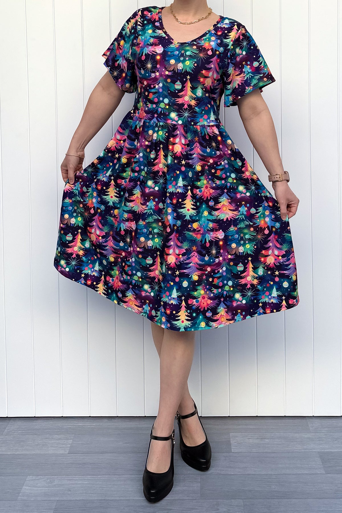 The Vivid Christmas Flutter Sleeve Knee Dress is a dazzling celebration of colour, joy and sparkle. Every swirl of light and tree-shaped wonder brings festive magic to life, wrapping you in the warmth of holiday cheer that's perfect for the Christmas party season.