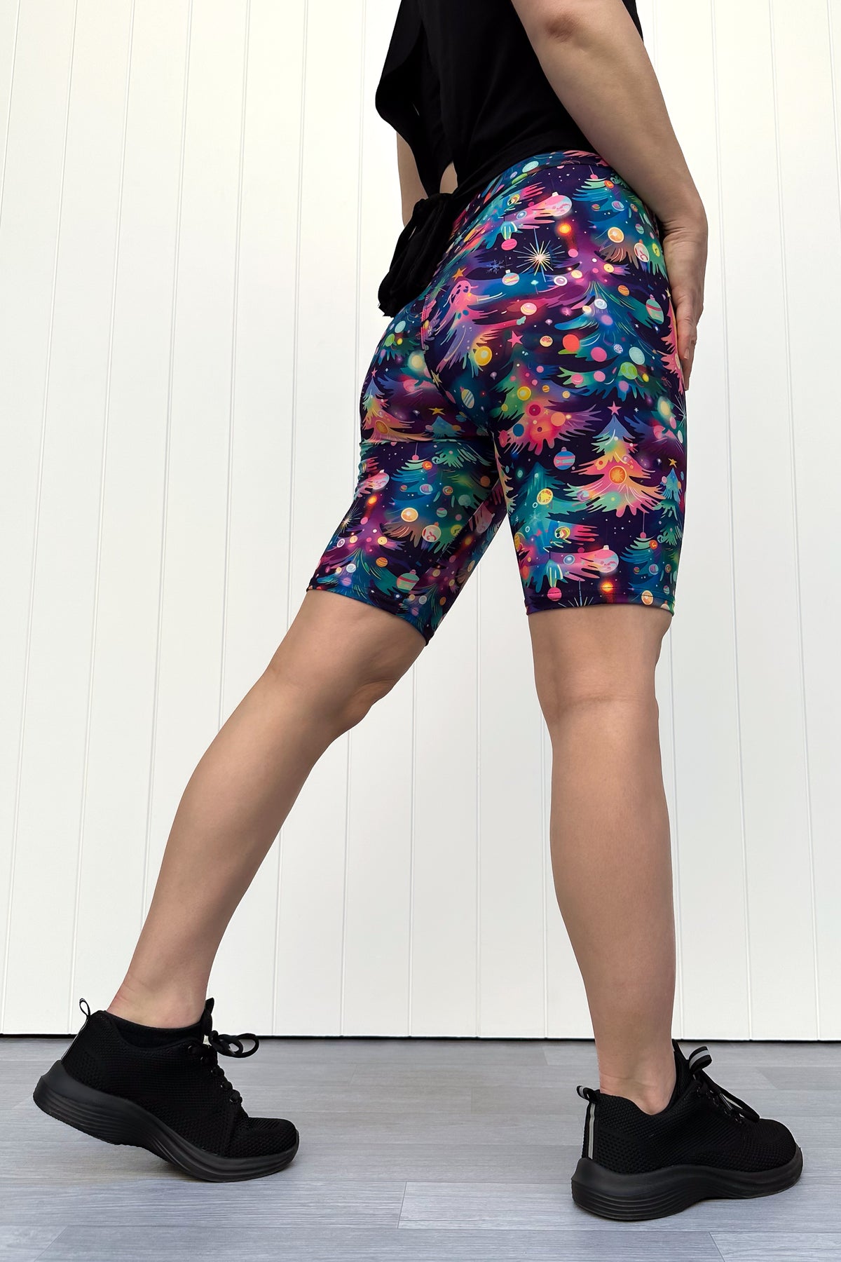 Person wearing shorts with a pattern of colourful Christmas trees against a white wooden panel background.