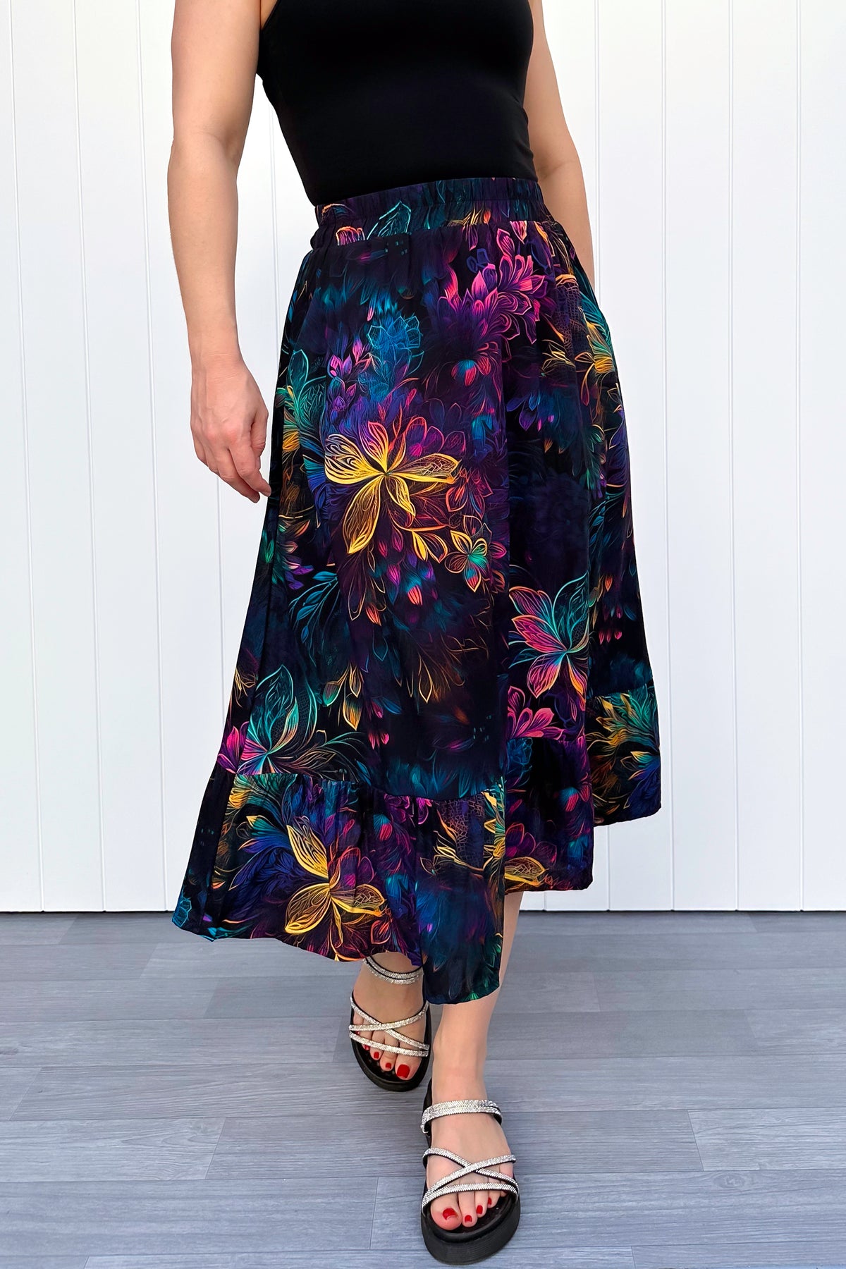 The Spectral Garden Zinnia Midi Skirt blooms in rich jewel tones against a deep moody base, layered with glowing petals that feel almost otherworldly. It’s dramatic, romantic and just mysterious enough to keep people looking twice. This midi skirt is crafted from lightweight, unlined rayon that moves freely with every step. The shirred elasticated waistband offers a flexible, comfortable fit, while the ruffled tier adds flow and movement. Finished with pockets because beauty should always come with function.